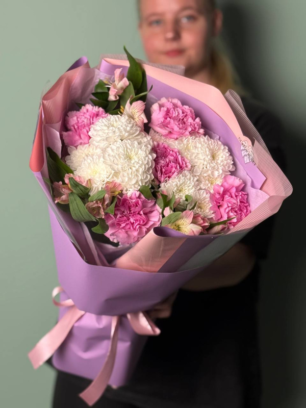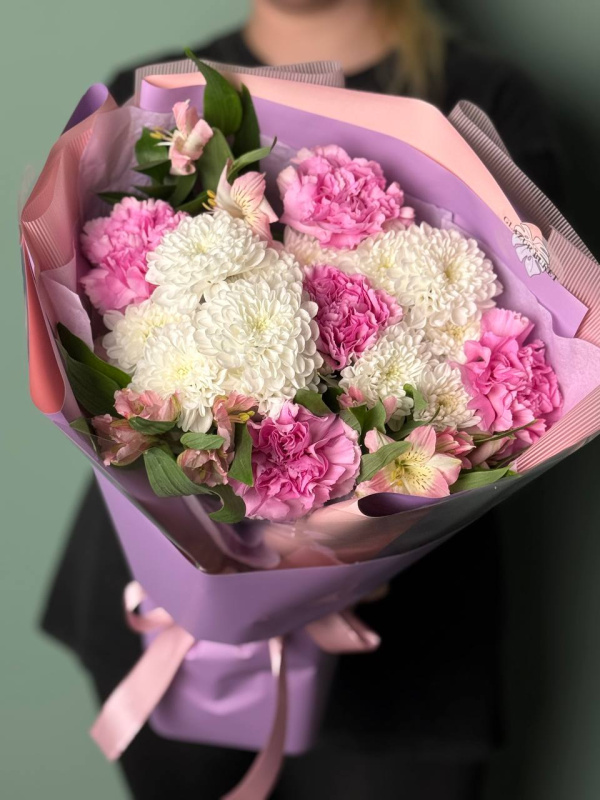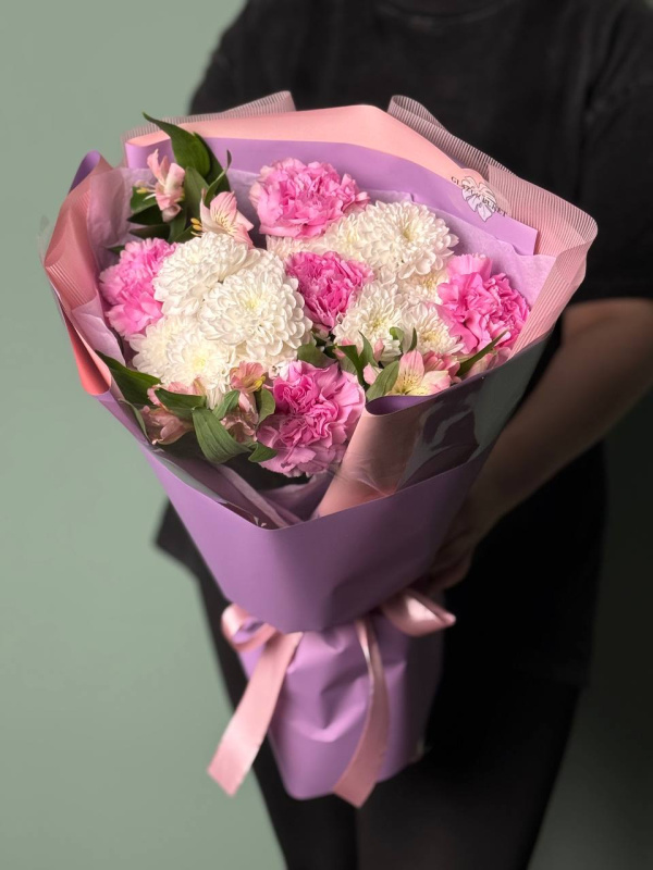 В составе букета: кустовая хрихантема - 2 шт, диантусы - 5 шт, альстромерия - 3 шт, тишью - 1 шт, упаковка - 2 шт.