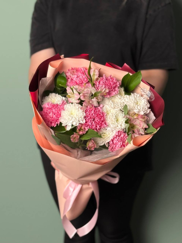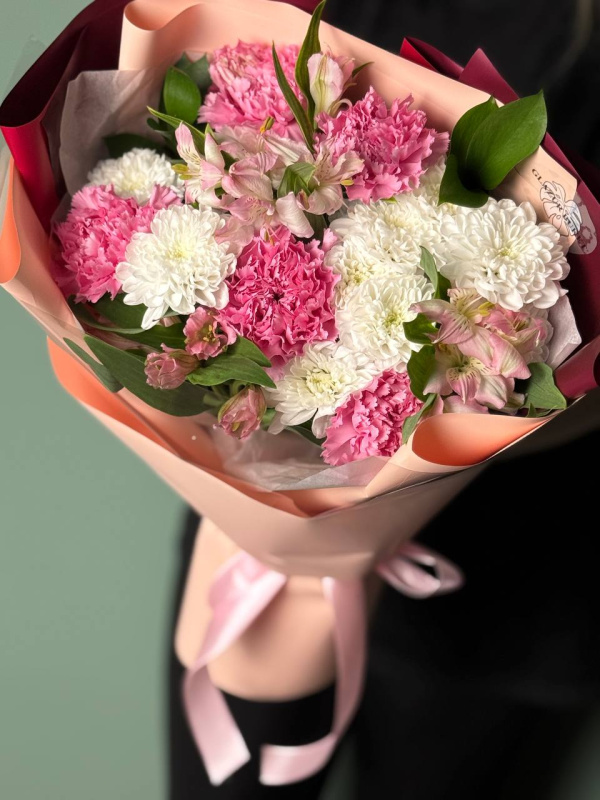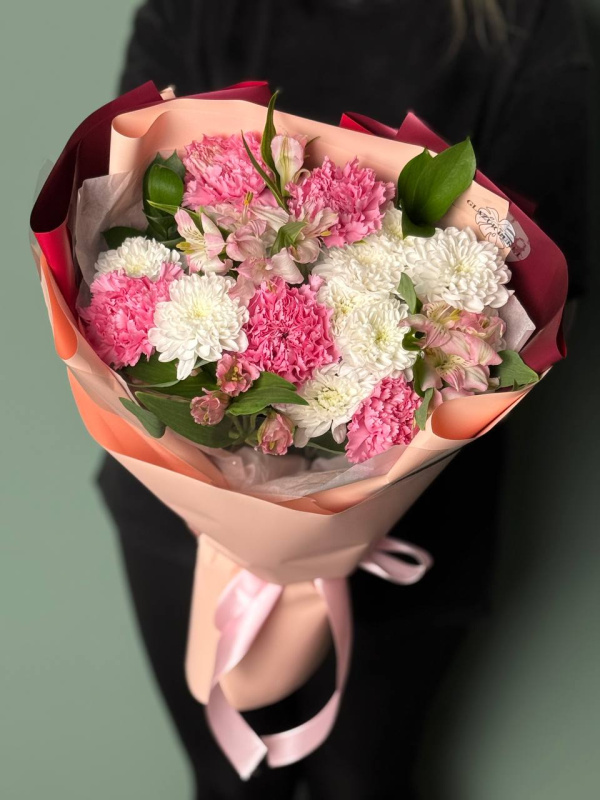В составе букета: кустовые хризантемы - 2 шт, альстромерия - 3 шт, диантусы - 5 шт, рускус - 2 шт, тишью - 1 шт, упаковка - 2 шт.