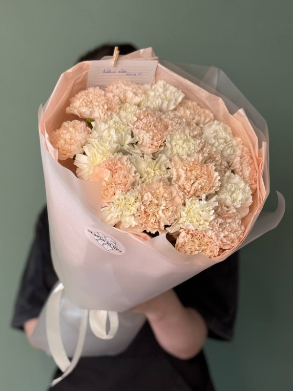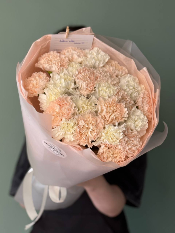 В составе букета: диантусы - 25 шт, тишью - 3 шт, упаковка - 1 шт.