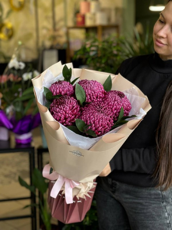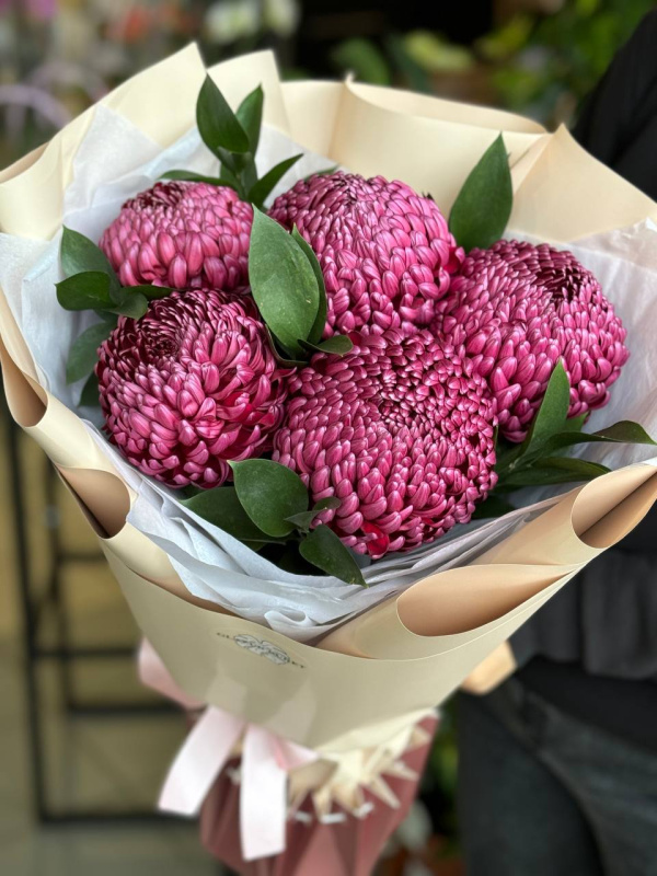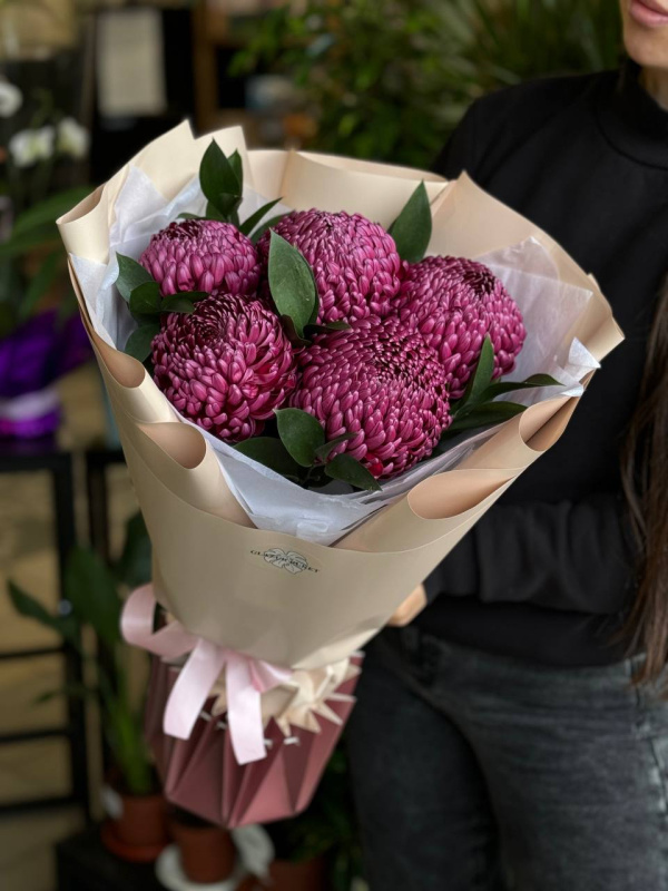 В составе букета: хризантемы бигуди - 5 шт, рускус - 6 шт, тишью - 2 шт, упаковка - 2 шт.