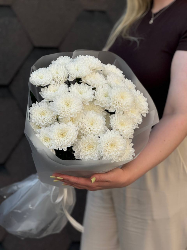 В составе букета: кустовые хризантемы - 5 шт, упаковка - 1 шт.