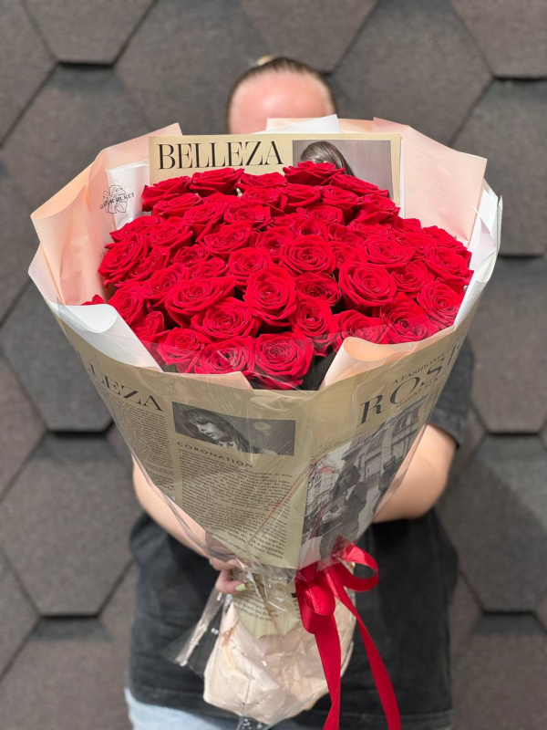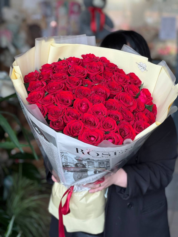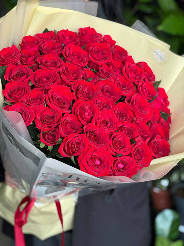 В составе букета: красные розы 50-60 см - 51 шт, упаковка - 2 шт.
