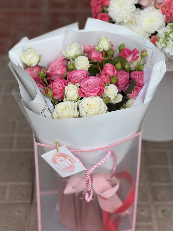 В составе букета: кустовые розы - 5 шт, упаковка - 2 шт, подарочный пакет - 1 шт, прищепка - 1 шт, открытка - 1 шт, водяная ножка - 1 шт.
