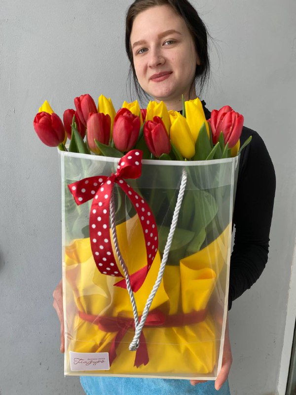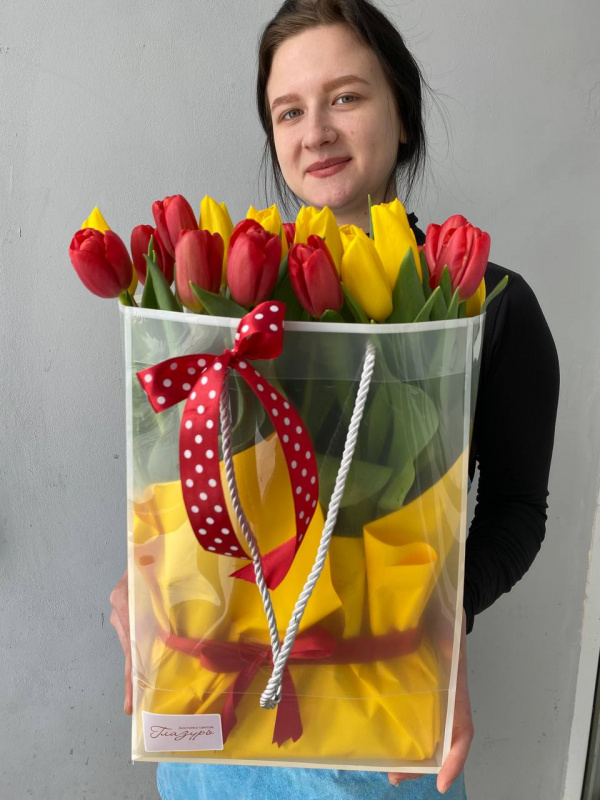В составе композиции: тюльпаны в цвете микс - 19 шт, оазис - 1 шт, упаковка - 1 шт, подарочный пакет - 1 шт.