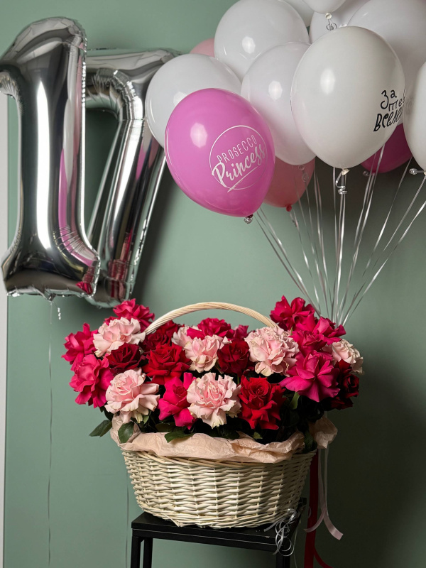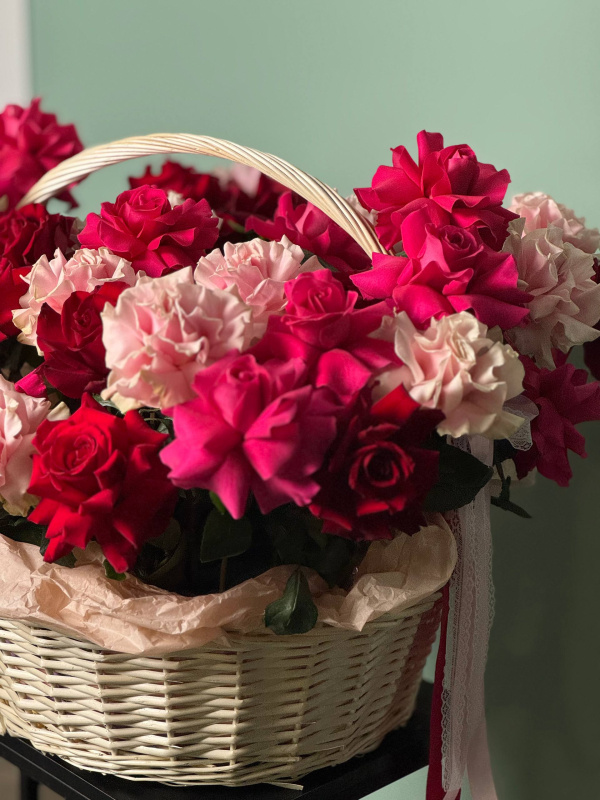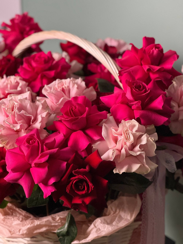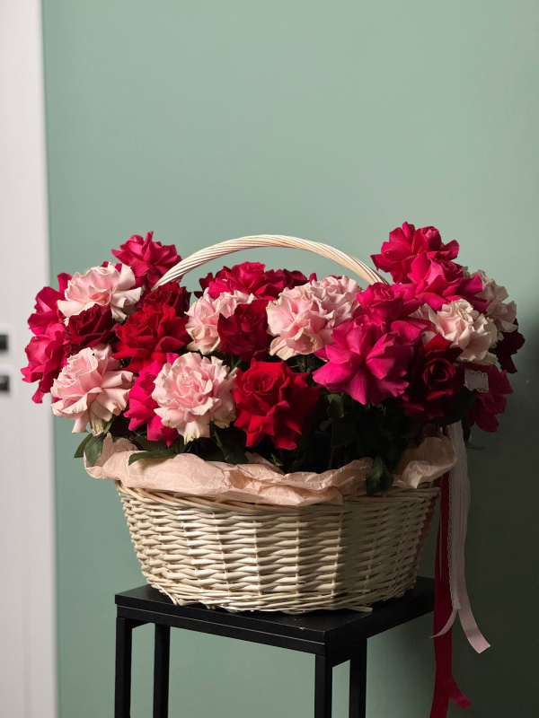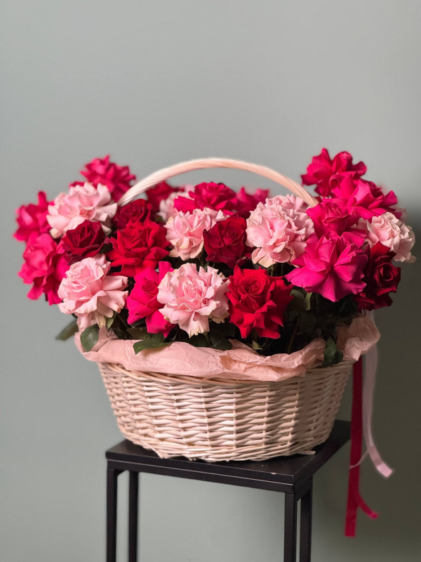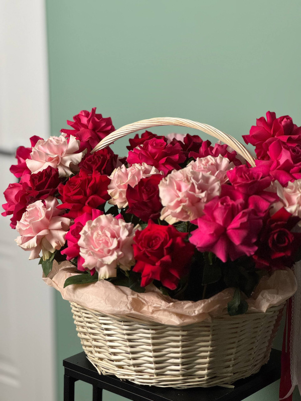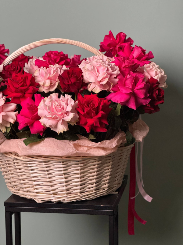 В составе композиции: французские розы - 45 шт, оазис - 7 шт, корзина - 1 шт, лента атласная - 2 шт, тишью - 3 шт.