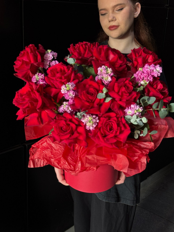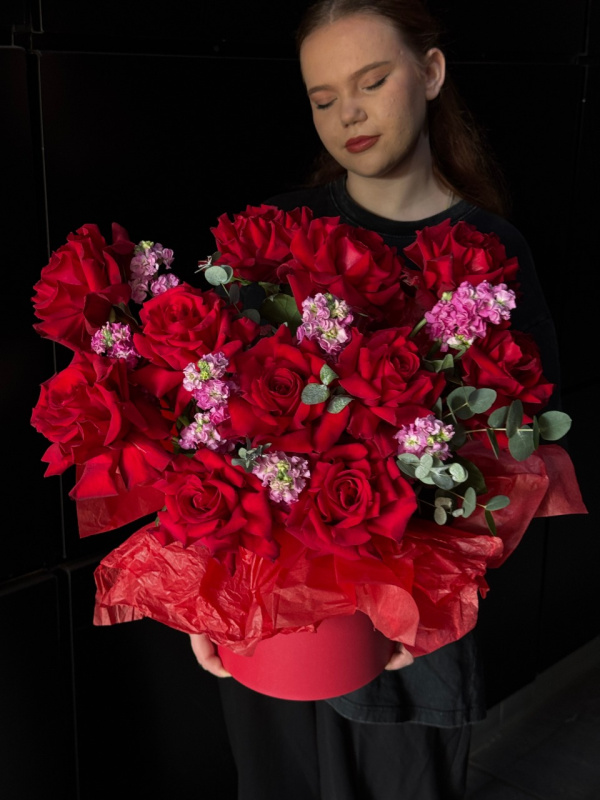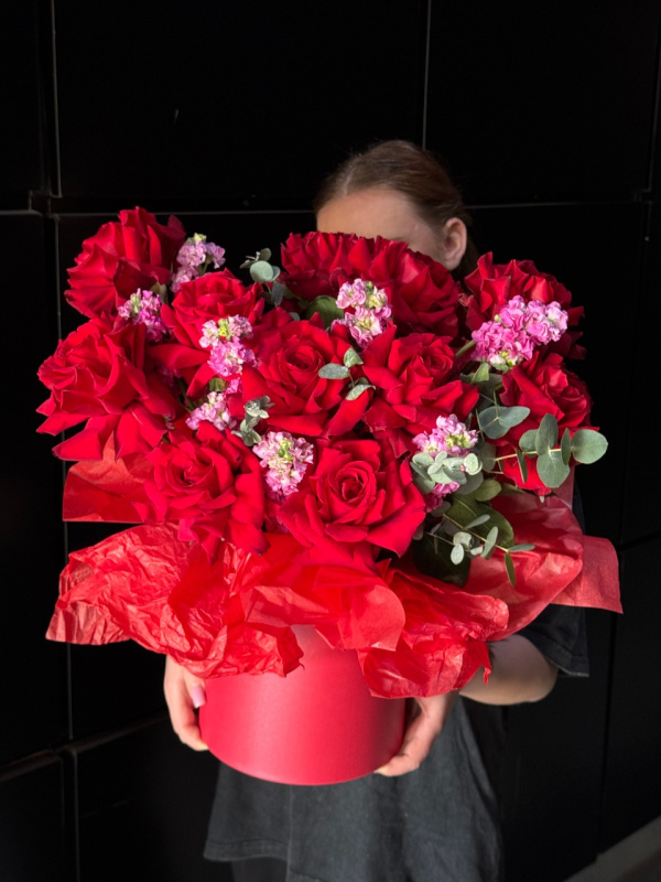 В составе композиции: француские розы - 11 шт, маттиола - 8 шт, эвкалипт - 4 шт, тишью - 2 шт, шляпная коробка - 1 шт, оазис - 1 шт.