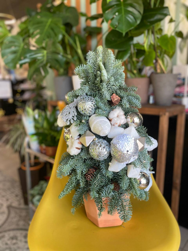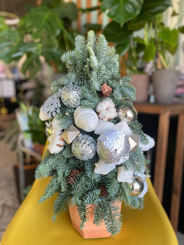 В составе: нобилис - 4 шт, елочные игрушки - 35 шт, хлопок - 5 шт, шишки - 6 шт, оазис - 3 шт, кашпо - 1 шт.