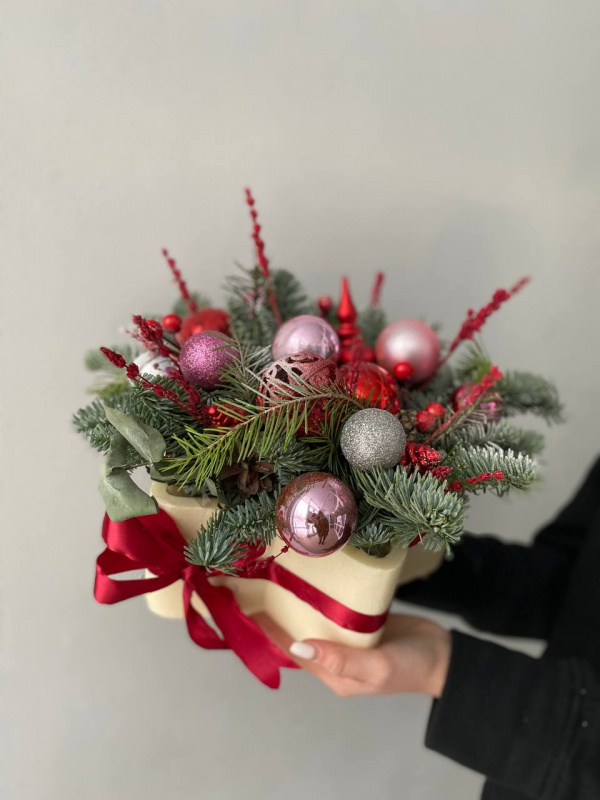 В составе: нобилис - 2 шт, елка - 1 шт, елочные игрушки - 8 шт, шишки - 5 шт, лагурус - 9 шт, эвкалипт - 2 шт, диантусы - 3 шт, оазис - 1 шт, корзинка - 1 шт, декоративная лента - 1 шт.