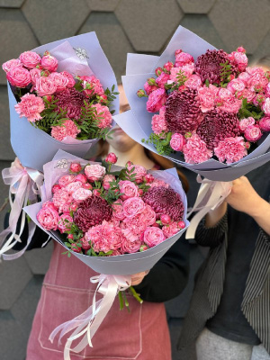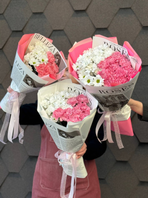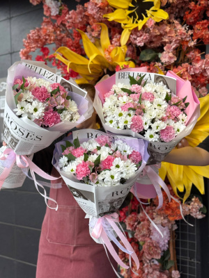 Нежный букет в пастельных тонах из кустовой хризантемы, диантусов и альстромерии. Эти цветы очень стойкие и будут долго радовать своей красотой