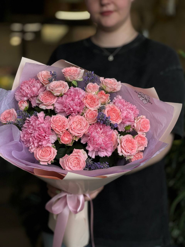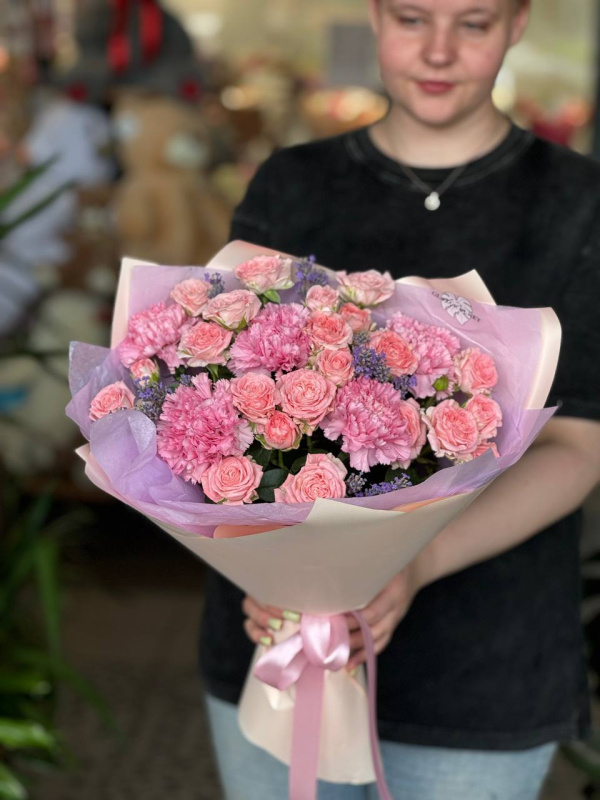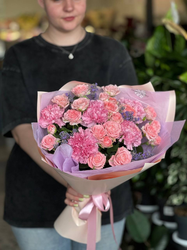 В составе букета: кустовые розы - 4 шт, диантусы - 5 шт, статица - 4 шт, тишью - 2 шт, упаковка - 1