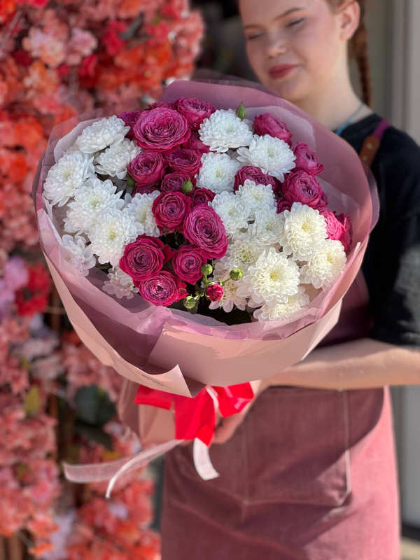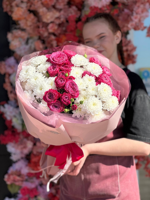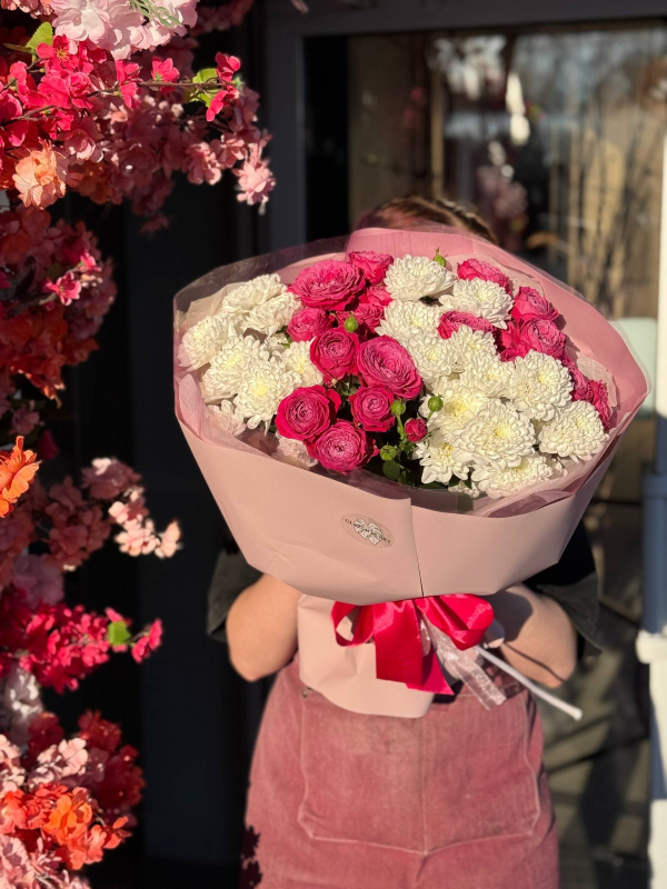 В составе букета: кустовые розы - 3 шт, кустовыые хризантемы - 3 шт, тишью - 2 шт, упаковка - 1 шт.