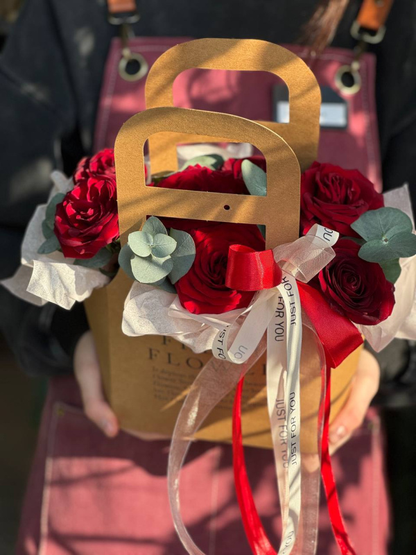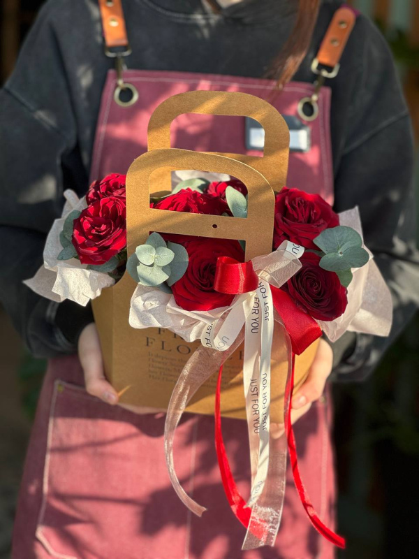 В составе композиции: розы красные - 7 шт, эвкалипт - 2 шт. тишью - 1 шт, лента - 1 шт, оазис - 1 шт, сумочка - 1 шт.