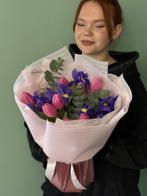 В составе букета: ирис - 5 шт, тюльпан - 9 шт, эвкалипт - 2 шт, пистация - 1 шт, тишью - 1 шт, упаковка - 2 шт.