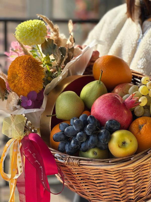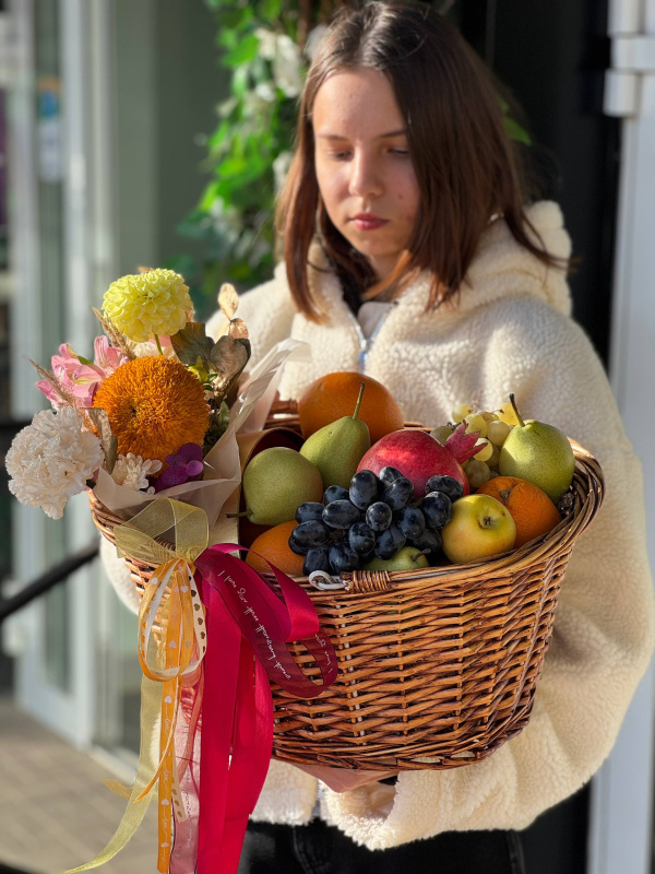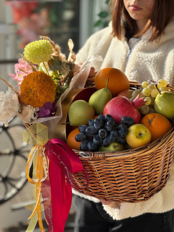 В составе: диантусы - 2 шт, альстромерия - 1 шт, георгин - 1 шт, подсолнух - 1 шт, эвкалипт - 1 шт, оазис - 1 шт, упаковка - 1 шт, корзина - 1 шт, фрукты - 1 шт.