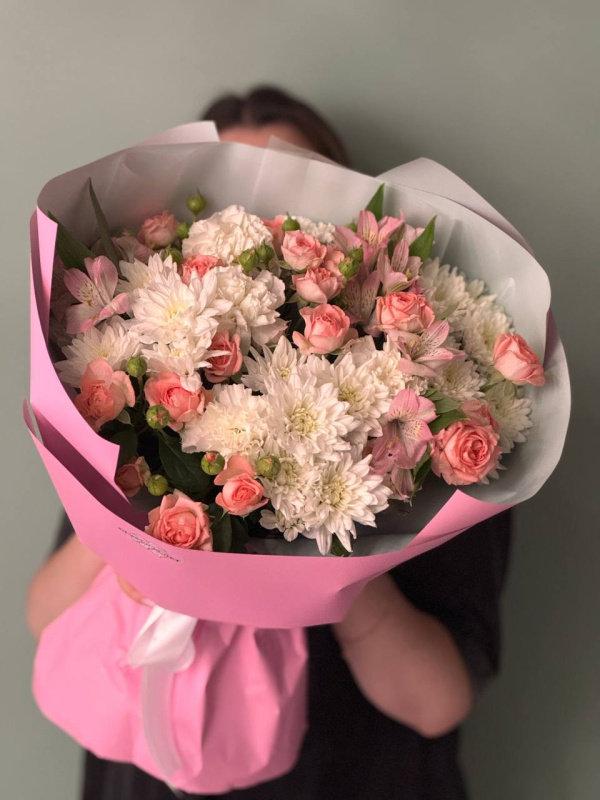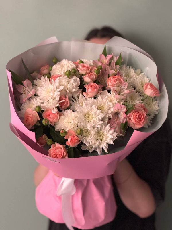 В составе букета: кустовые розы - 4 шт, кустовые хризантемы - 4 шт, альстромерия - 3 шт, упаковка - 1 шт.