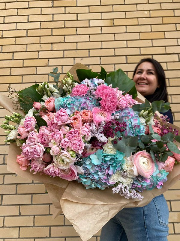 В составе букета: гортензия - 5 шт, ранункулус - 7 шт, кустовая роза - 15 шт, эустома - 5 шт, тропическая пальма - 3 шт, эвкалип - 5 шт, хамелациум - 5 шт, статица - 9 шт, диантусы - 15 шт, упаковка - 2 шт.
