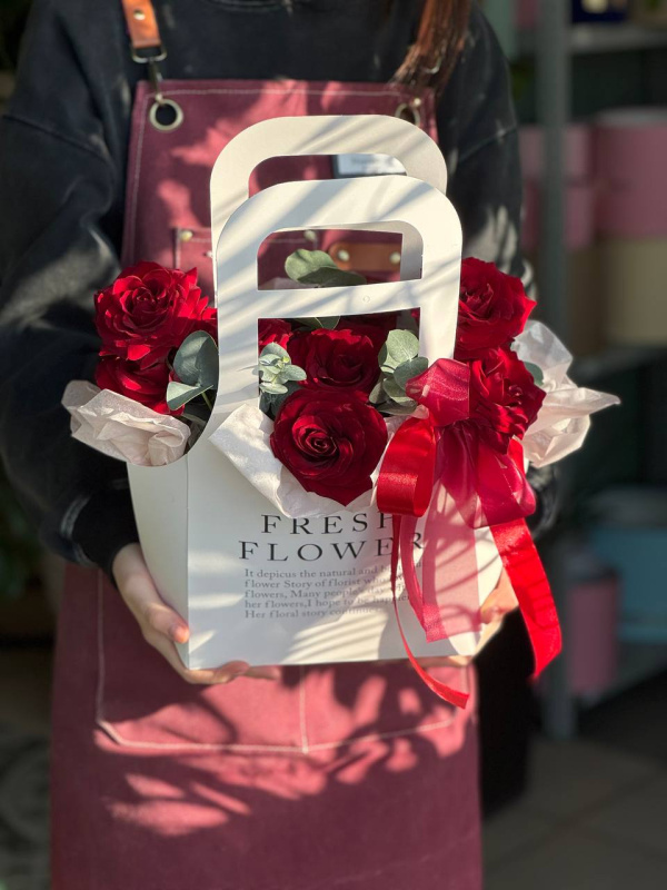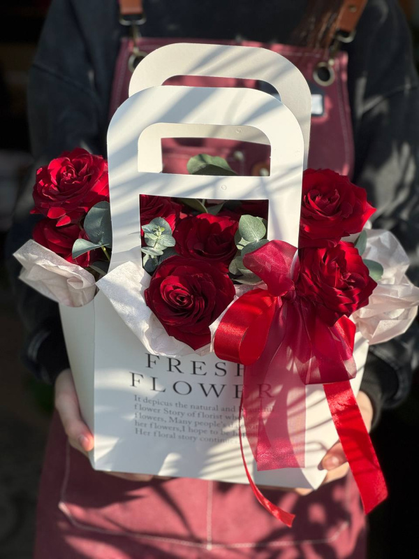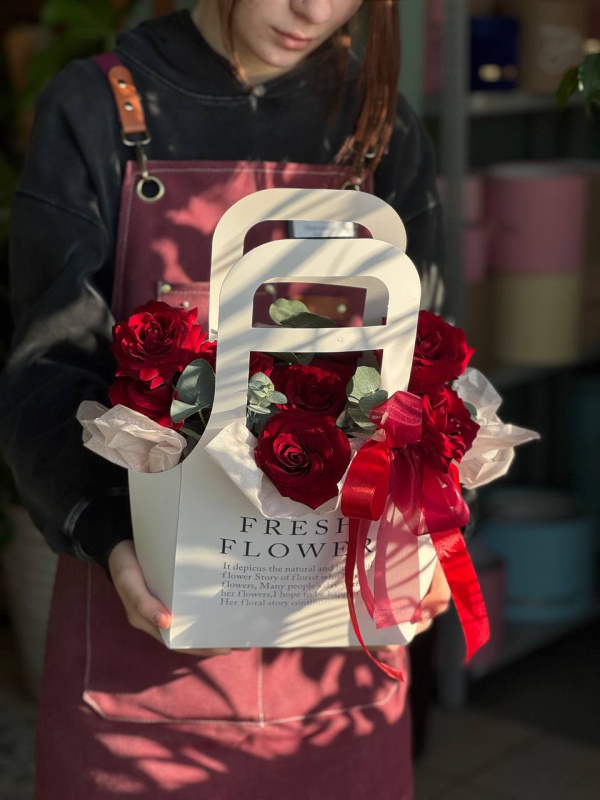 В составе композиции: розы красные - 7 шт, эвкалипт - 2 шт. тишью - 1 шт, лента - 1 шт, оазис - 1 шт, сумочка - 1 шт.