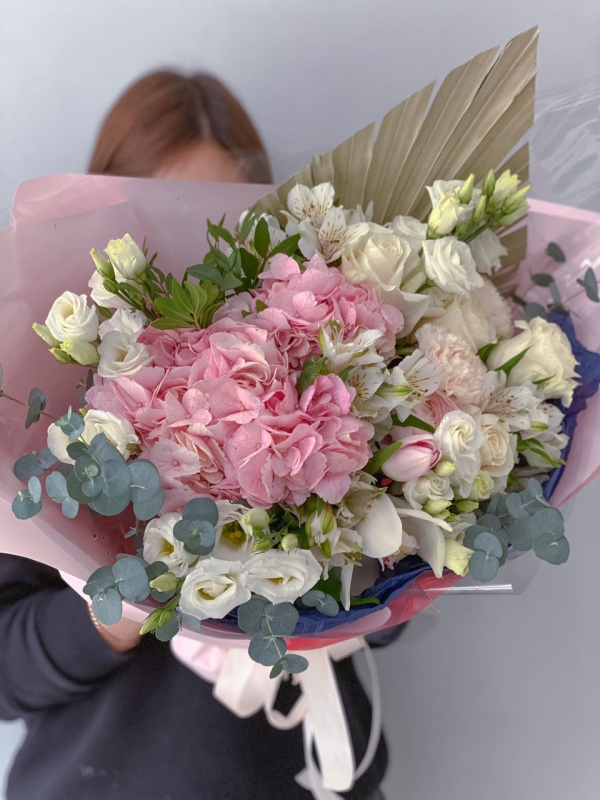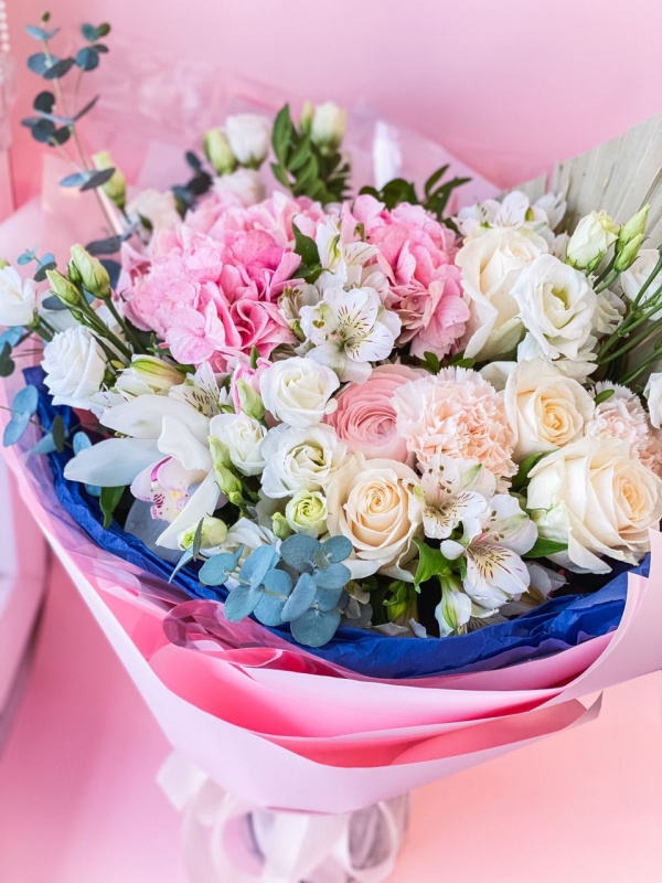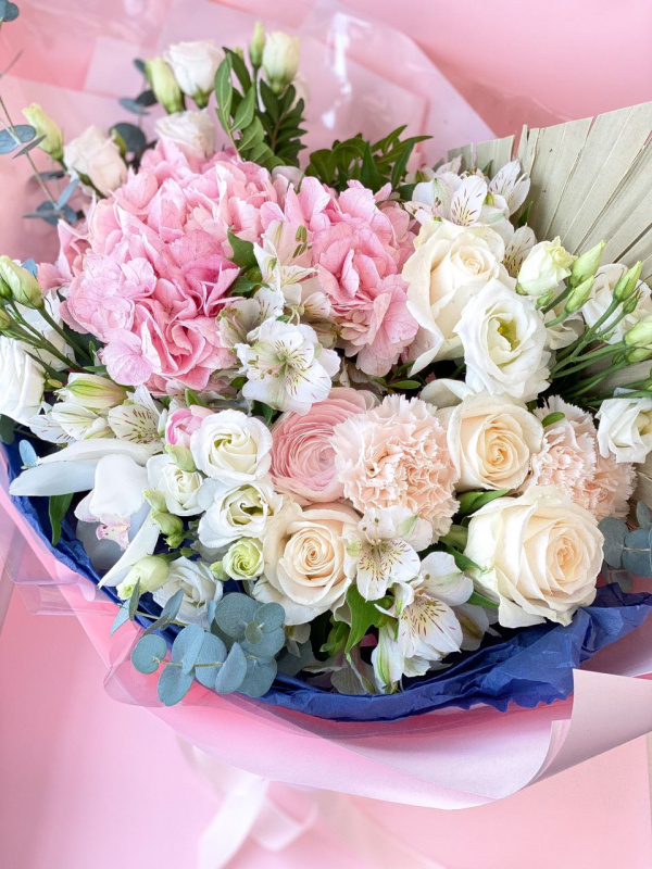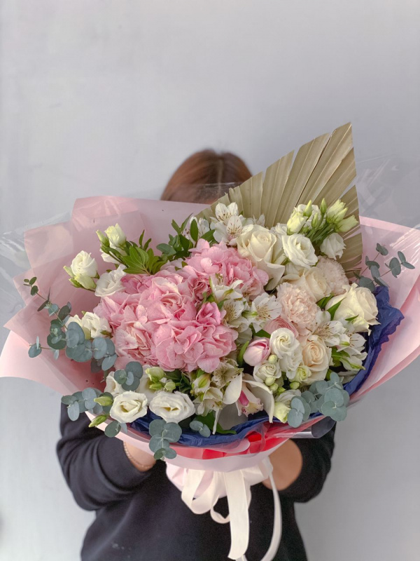 В составе букета: 1 гортензия, 3 эустомы, 3 диантуса ,5 голландских роз,1 ранункулюс,5 эвкалиптов,1 тюльпан, 5 альстромерий,1 орхидея,2 пистации, 1 лист пальмы(декор), 2тишью(декор), оформление букета
