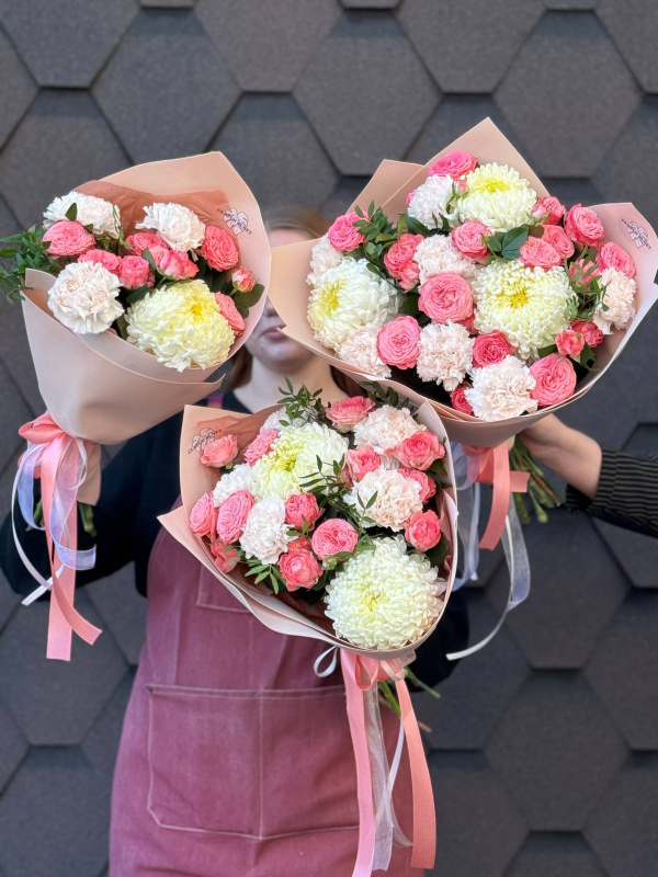 Размер S - одноголовая хризантема - 1 шт, кустовая роза - 2 шт, диантусы - 3 шт, пистация - 1 шт, тишью - 1 шт, фоамиран - 1 шт, лента - 1 шт.