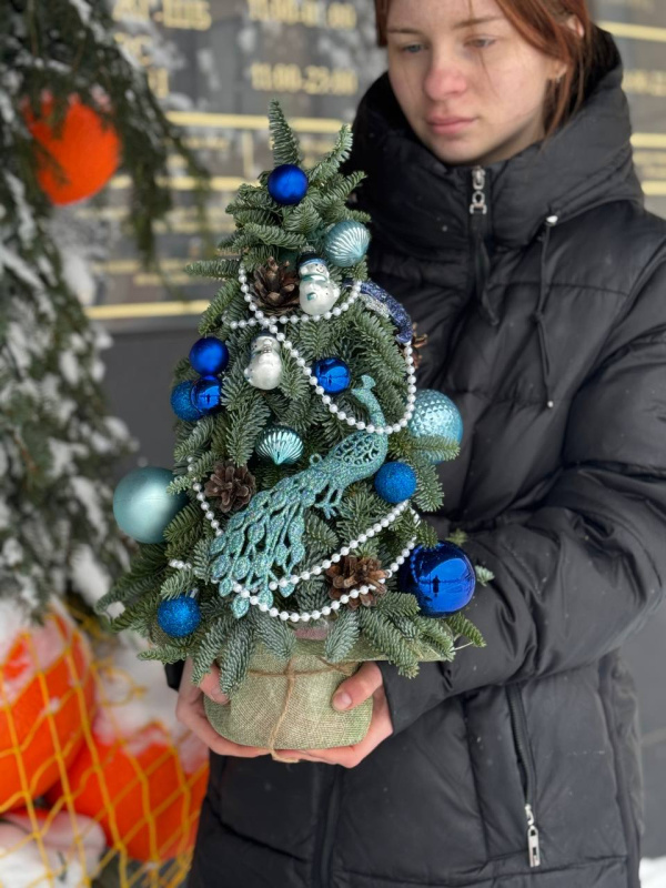 В составе композиции: оазис - 2 шт, упаковка - 1 шт, нобилис - 1,5 шт, средняя игрушка - 3 шт, игрушка маленькая - 11 шт, шишка - 4 шт, украшение на елку птица - 1 шт, бусы - 1шт, украшение на елку месяц - 1 шт.