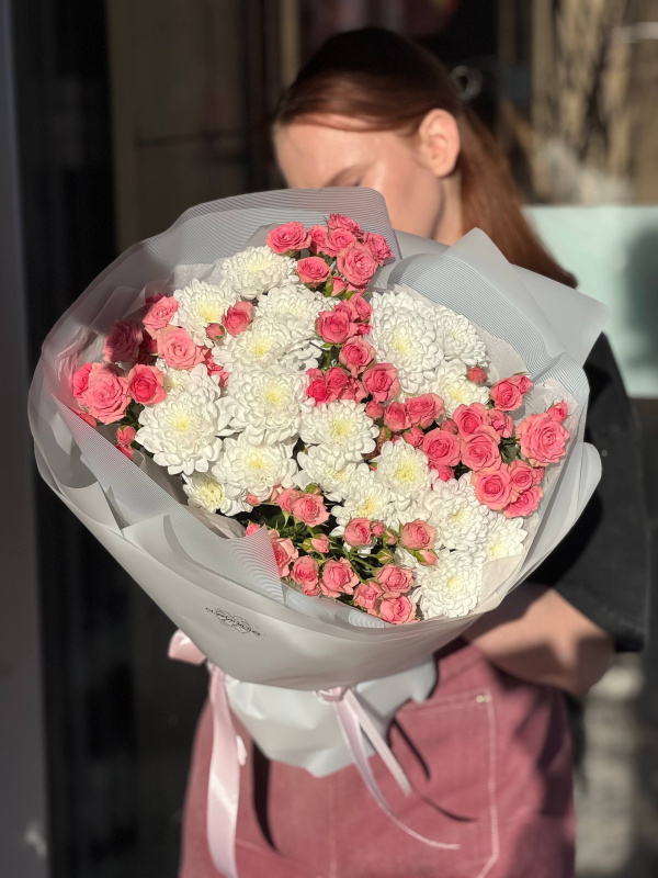 В составе букета: кустовые хризантемы - 4 шт, кустовые розы 5 шт, тишью - 2 шт, упаковка - 1 шт.