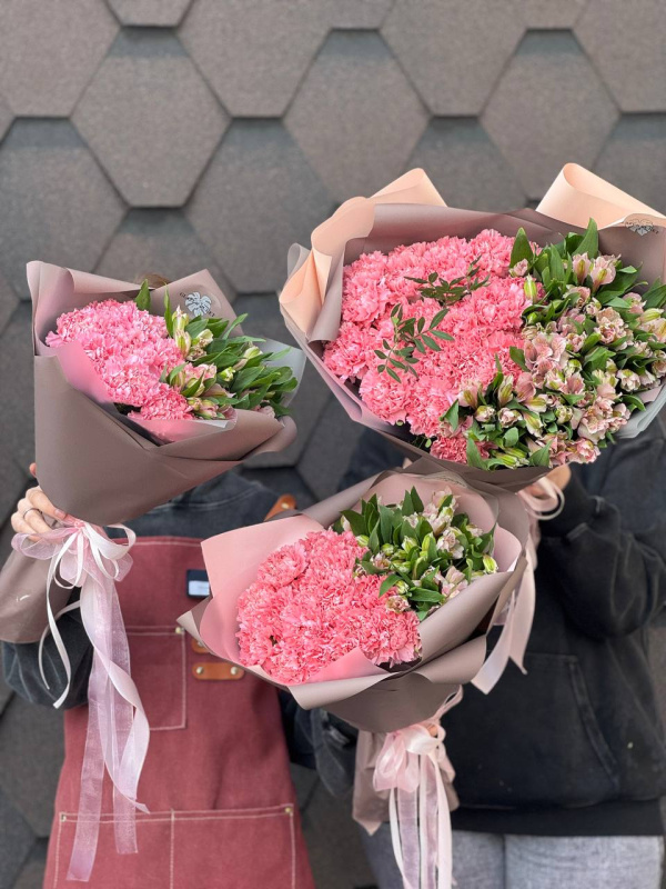 Размер М - диантусы - 15 шт, альстромерия - 12 шт, упаковка - 3 листа, лента - 1 шт.