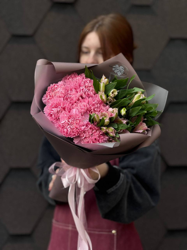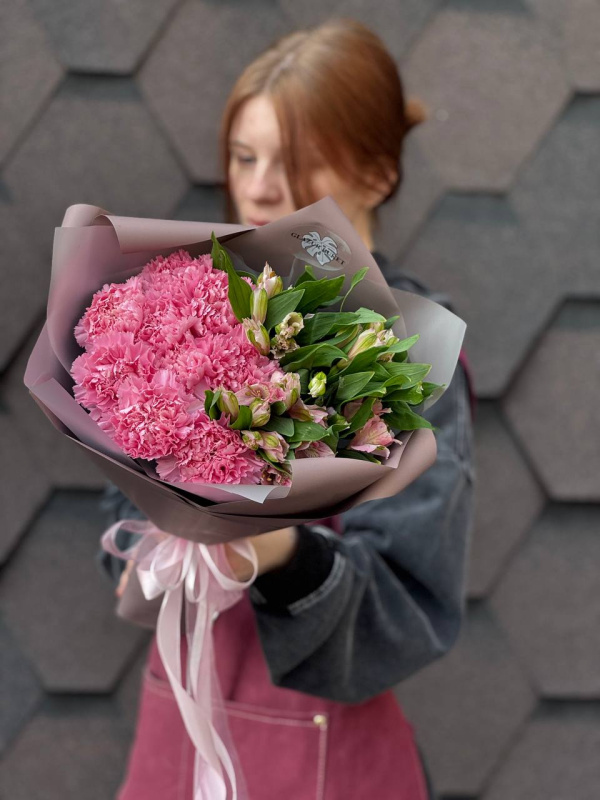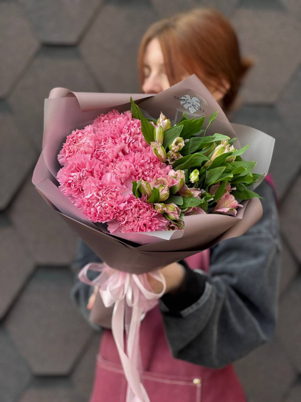Размер S - диантусы - 9 шт, альстромерия - 8 шт, упаковка - 3 листа , лента - 1 шт.