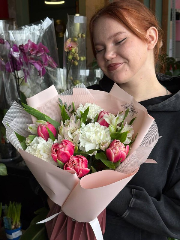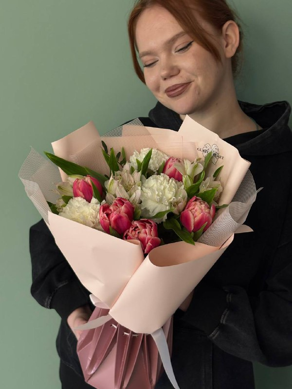 В составе букета: диантусы - 3 шт, альсттромерия - 3 шт, тюльпан пионовидный - 5 шт, пистация - 1 шт, упаковка - 2 шт.