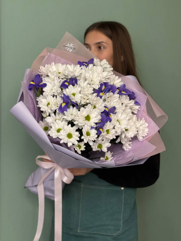 Прованс с ирисами - букет в бело-фиолетовой гамме с пышными кустовыми хризантемами и ирисами.