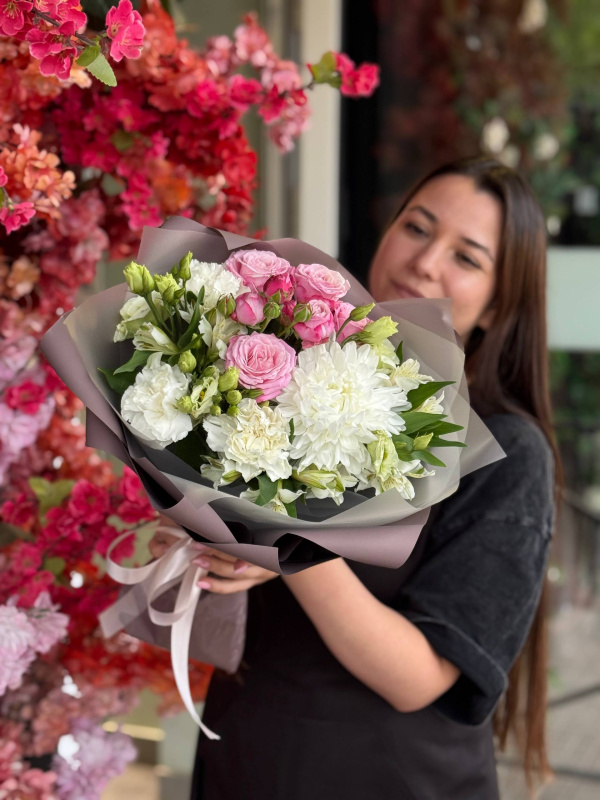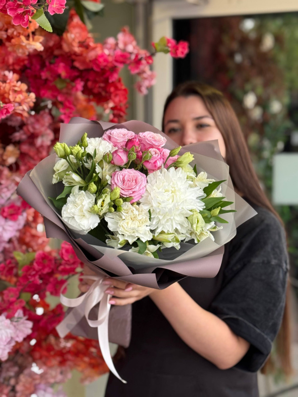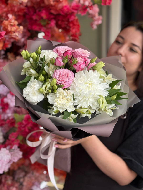 В составе букета: одноголовая хризантема - 1 шт, кустовая роза - 1 шт, эустома - 1 шт, альстромерия - 3 шт, диантусы - 3 шт, упаковка - 3 листа.