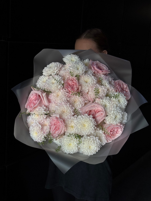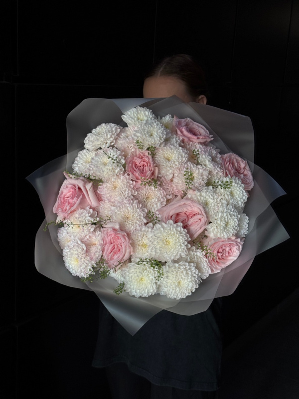 В составе букета: кустовые хризантемы - 6 шт, пионовидные розы - 7 шт, тиласпия - 4 шт, упаковка - 1 шт.