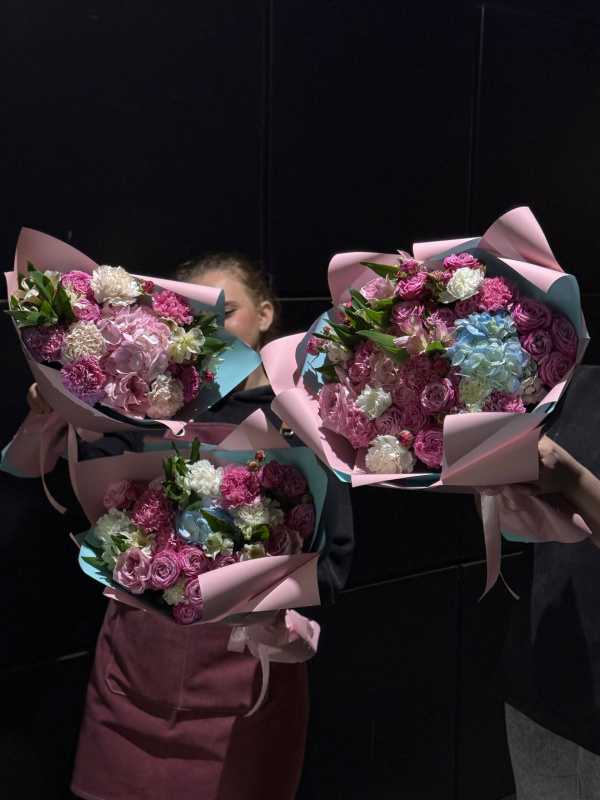 Размер M - кустовая роза - 3 шт, диантусы - 8 шт, гортензия - 1 шт, альстромерия - 3 шт, пионовидная роза - 2 шт, упаковка - 3 листа.