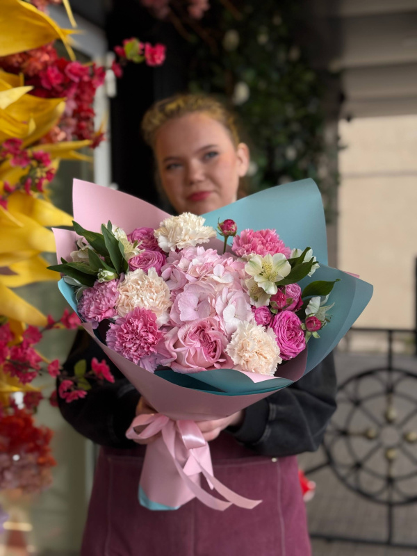 Размер S - кустовая роза - 2 шт, диантусы - 6 шт, гортензия - 1 шт, альстромерия - 2 шт, пионовидная роза - 1 шт, упаковка - 1 шт.