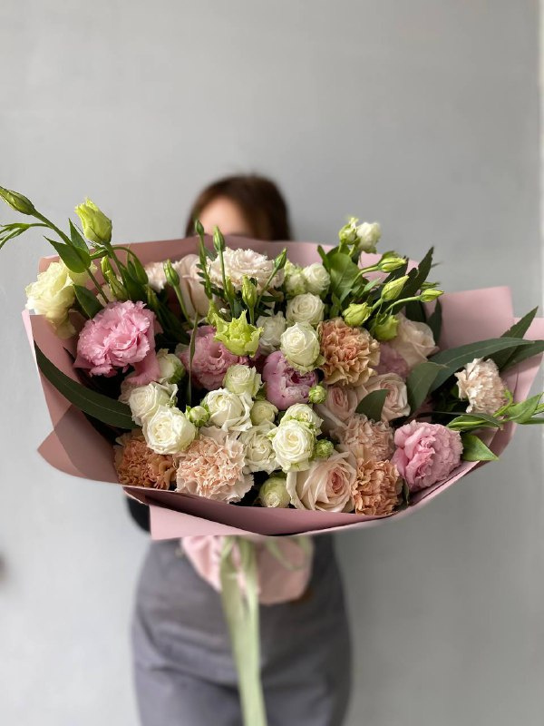 В составе букета : диантусы - 7 шт, кустовые розы - 4 шт, пионовидные розы - 5 шт, эустома - 5 шт, эвкалипт - 2 шт, упаковка - 1 шт.