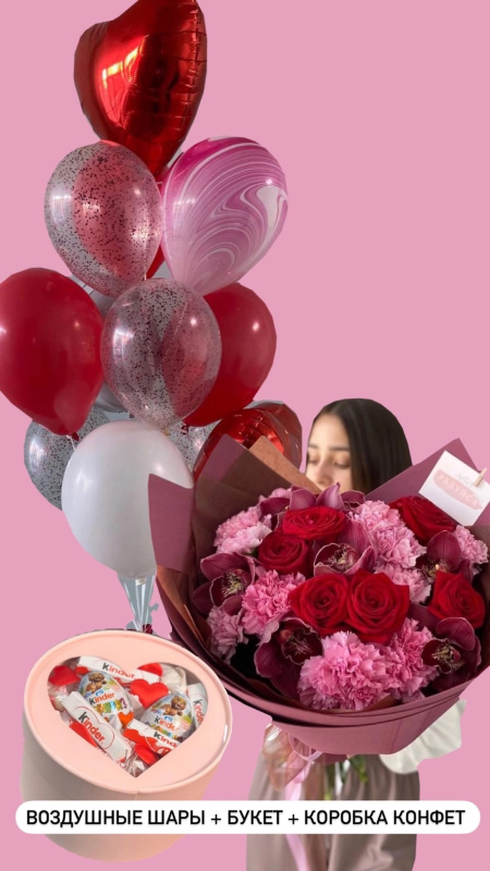 В составе набора: сборный букет, коробка конфет и охапка шаров.