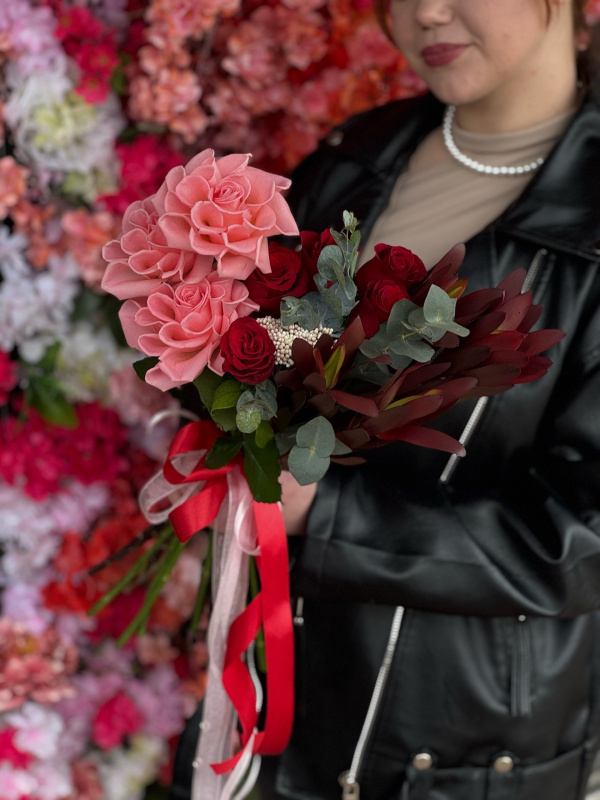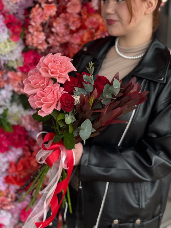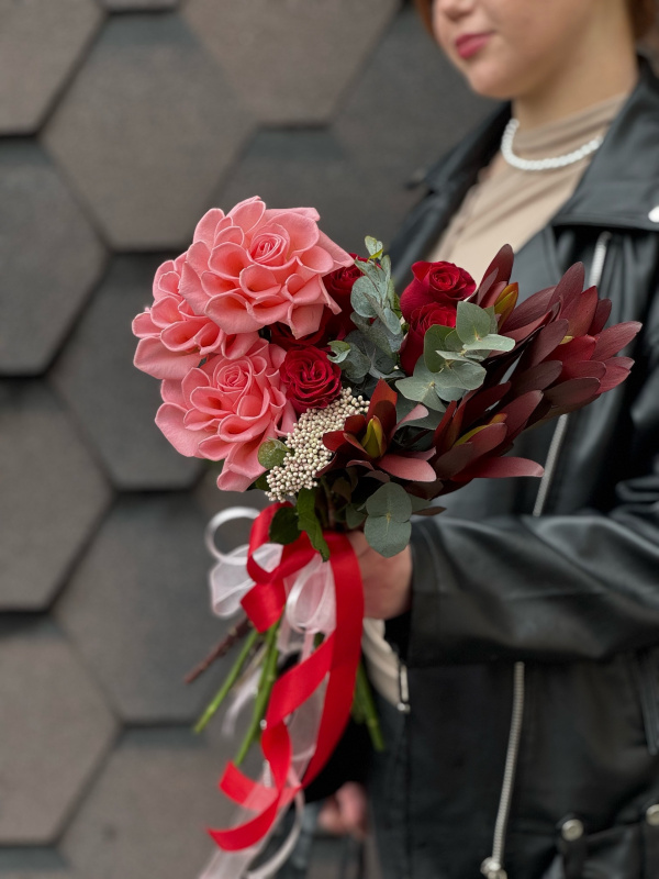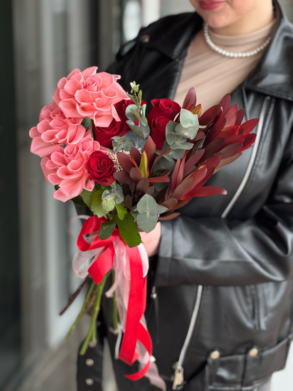 В составе букета: розы эксплорер - 5 шт, французкие розы - 3 шт, леукандендрон - 4 шт, эвкалипт - 3 шт, озотамнус - 1 шт, лента - 1 шт.