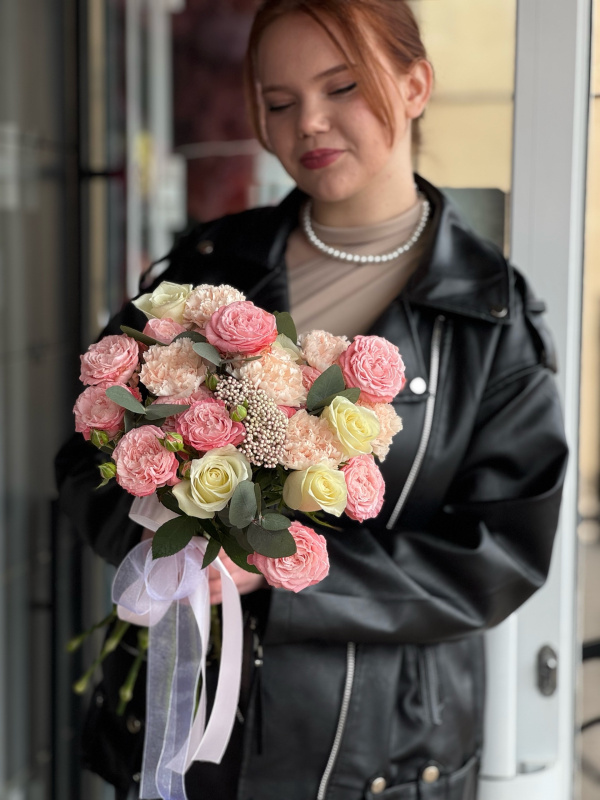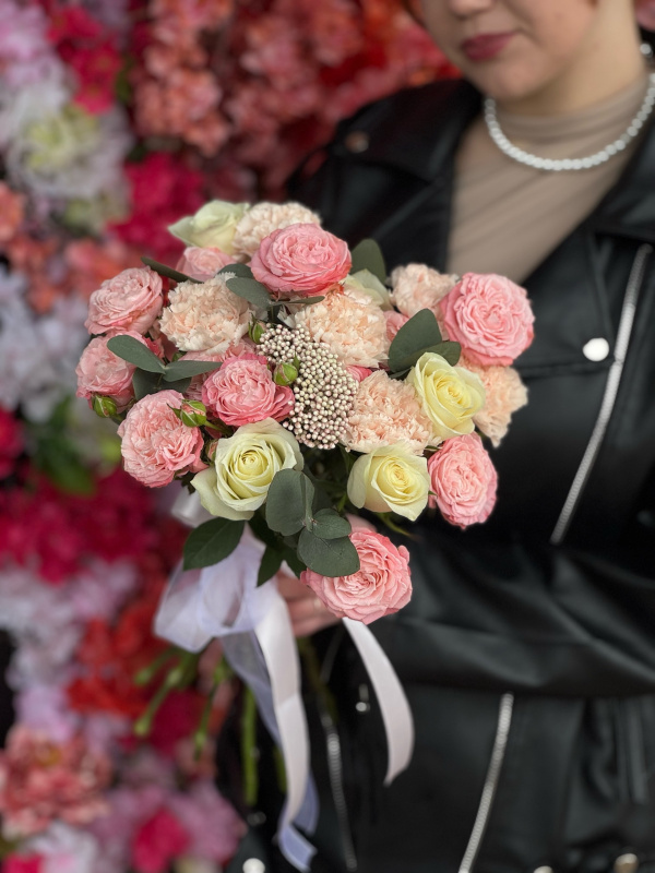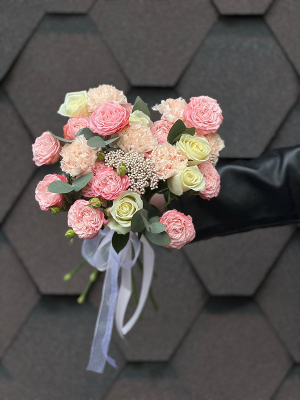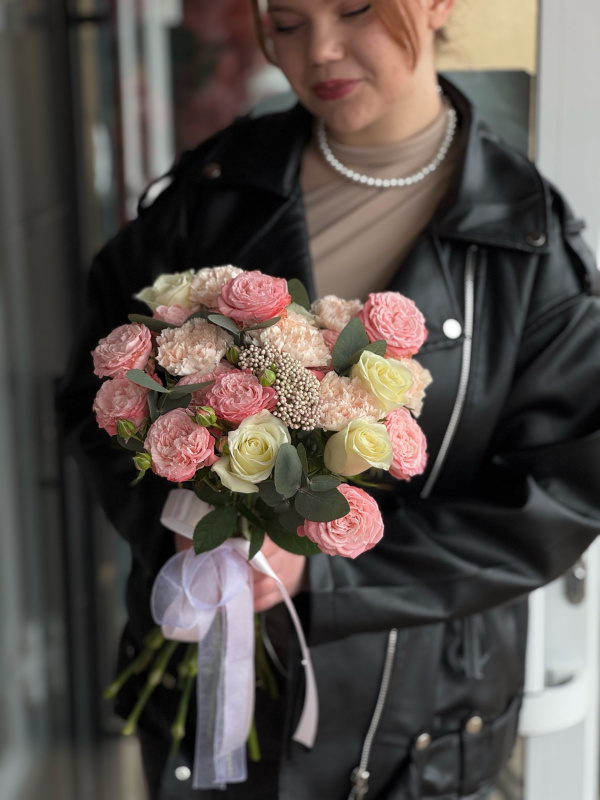 В составе букета: кустовые розы - 3 шт, диантусы - 5 шт, роза атена - 5 шт, озотамнус - 1 шт, эвкалипт - 5 шт, лента - 1 шт.