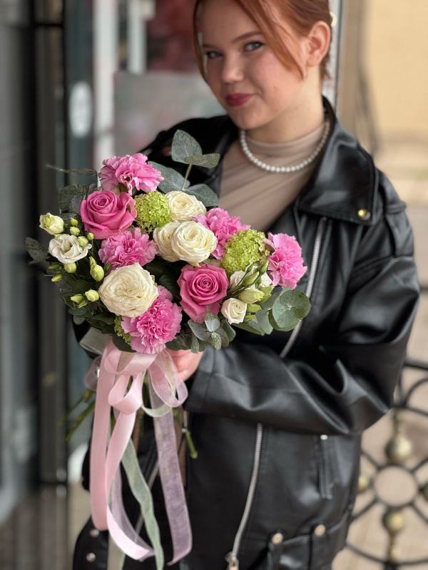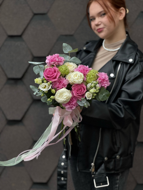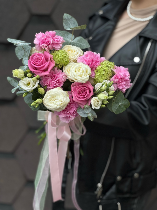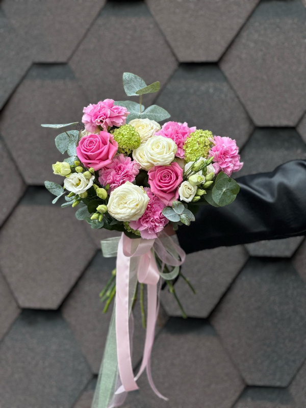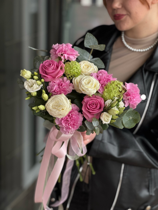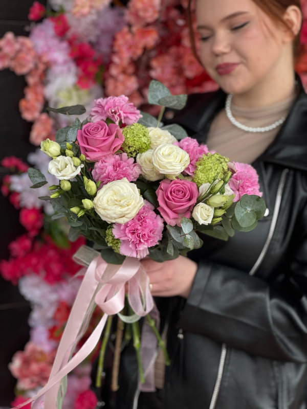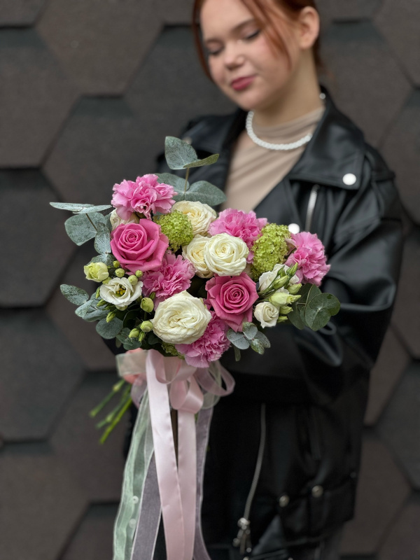 В составе букета: кустовые розы - 2 шт, вибурнум - 1 шт, диантусы - 5 шт, эустома - 2 шт, розы одноголовые - 2 шт, эвкалипт - 5 шт, лента - 1 шт.