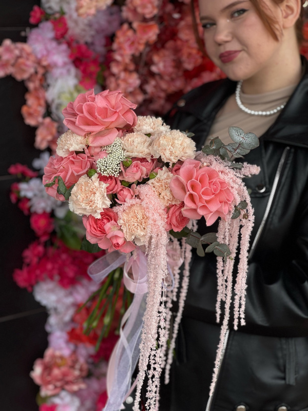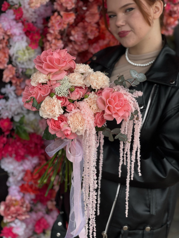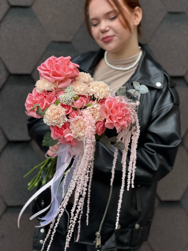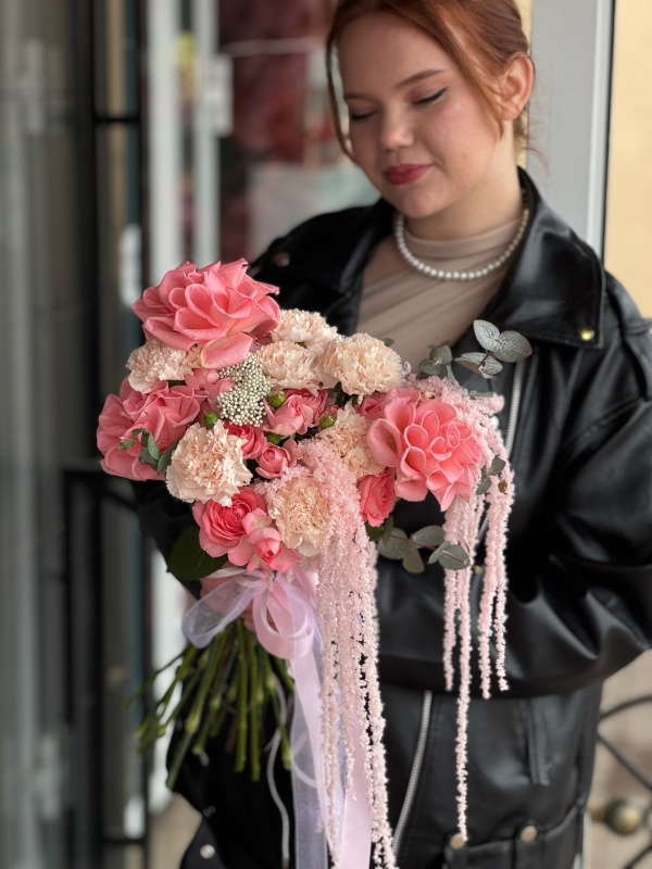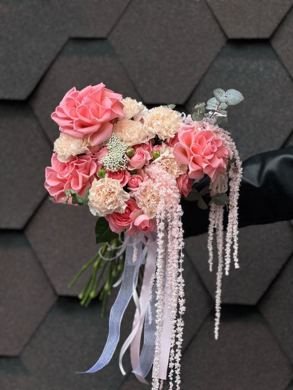В составе букета: французские розы - 3 шт, диантусы - 7 шт, озотамнус - 1 шт, кустовая роза - 3 шт, амарантус -1 шт, эвкалипт - 3 шт, лента - 1 шт.